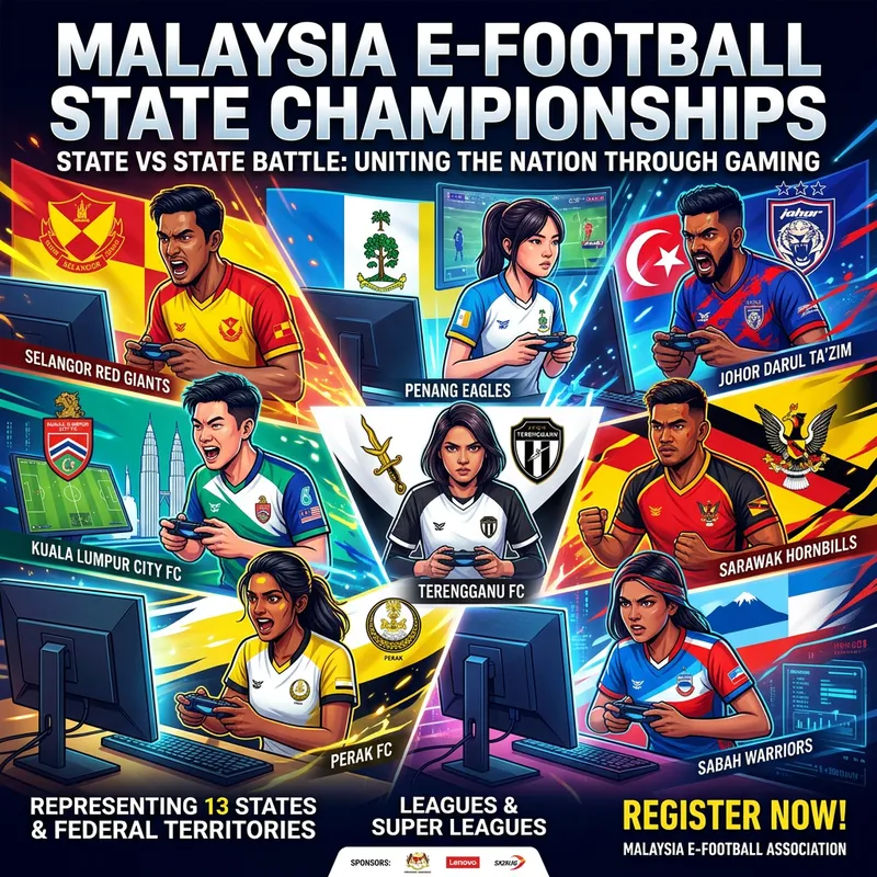 Create a poster displaying a range of e-football (esport) players, each representing their respective states within Malaysia's leagues and super leagues. These players should be seen in action, mid-play, with the intensity and energy of competition evident on their faces. The background should reflect the colors and emblems of their states. Include depictions of various gaming equipment relevant to eFootball, like controllers and screens. The players should have a mix of ethnicities including Malay, Chinese, Indian, and others, reflecting the diverse population of Malaysia. Also, ensure a balance of genders, illustrating men and women gamers equally.