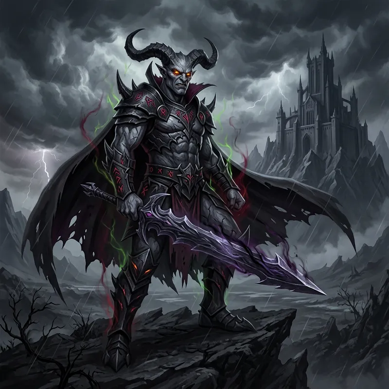 Create an image of a demonic entity, who is the offspring of a dark and menacing overlord. The demonic entity carries traits of virulence and malevolence, has grayish skin tone with haunting eyes symbolizing his sinister lineage. His aura radiates pure chaos and destruction, and the atmosphere around him is typically dark and stormy, symbolizing his tumultuous existence.