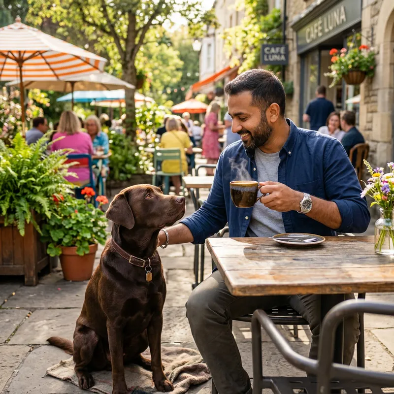 Man Enjoying Coffee with Loyal Labrador Dog at Sunny Cafe