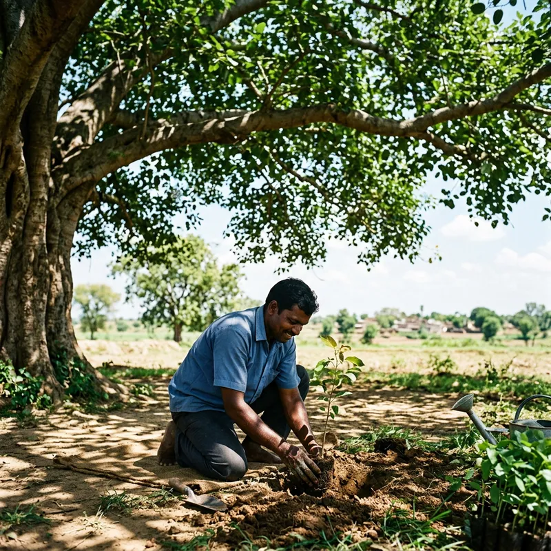 Visualize an image of a large, sturdy tree-extending its wide, green leafy branches to shield a South Asian man. This man, kneeling on the sun-drenched ground, is engrossed in the act of planting a young sapling. The protective umbrella-like spread of the overhead tree provides them a safe haven, not only from the harsh sunlight but also from the destructive external pollutants. The air around them is cleaner and noticeably fresher, with the sun rays filtering through the leaves creating a surreal, dazzling pattern on the grass beneath.