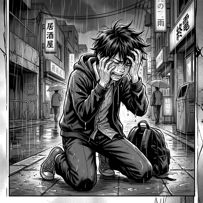 A manga-style illustration of a boy crying. His tears flow freely. He has spiked hair and is dressed in casual attire, suggesting he might be a student. Express his emotions strongly through his face and body language for a vivid depiction of sadness and despair.