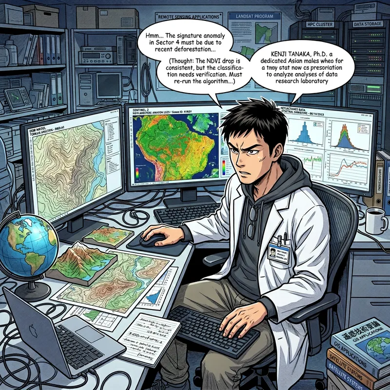 Illustration in manga style for a postdoc character engaged in remote sensing work. The scene should demonstrate the character, who is an Asian male, studying satellite images on multiple monitors in a well-equipped room filled with high-tech equipment. The character has a determined expression on his face, evidenced by his narrow, focused eyes and slight frown as he analyzes data. His clothes reflect his professional status, wearing a white lab coat over a casual outfit. Detailed elements of the remote sensing field should be present, like printed topographic maps, 3D models of earth, and graphs representing data.