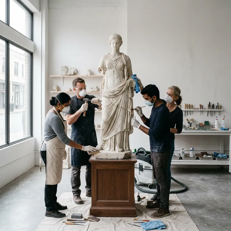 An elegant scene of marble restoration in a minimalist setting. There are a group of skilled artisans diligently at work, restoring the lustrous, white marble exterior of a damaged antique statue. The area is characterized by its minimalist aesthetic, with sparse but functional furniture and a monochrome color scheme. Tools of the trade, including chisels, sandpaper, and microfiber cloths, are carefully organized and within easy reach. The workers, a mix of Caucasian and South Asian men and women, work in harmony, their concentration evident by their focused expressions and precise movements. Each worker is dressed in protective gear, including dust masks, gloves, and visors, ensuring safety during the intricate process of restoration.