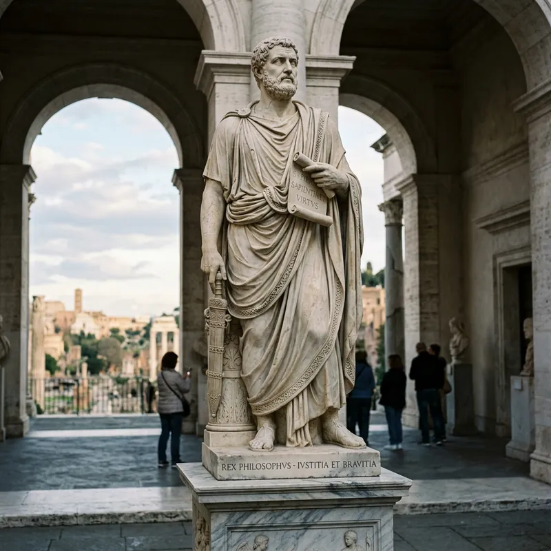 A statue of an ancient Roman philosopher-king, not specifically Marcus Aurelius but possessing similar attributes. The figure stands erect with a countenance reflecting bravery and wisdom. The statue Dons a regal toga, one hand holding a scroll symbolic of his philosophical explorations, and the other hand resting on a sword indicative of his imperial rule. The statue is placed on a pedestal, made of polished marble, giving it a historical and majestic aura.