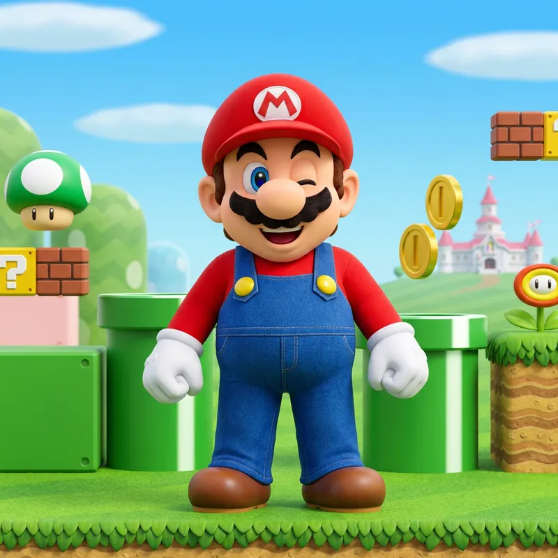 A well-known video game character of Italian descent with a name starting with the letter 'M'. This character is often seen in red apparel and is known for his cheerful personality. He has a recognizable mustache, a hat, and always sports a pair of blue overalls. Do not forget to include elements popularly associated with his world, like warp pipes and power-up mushrooms.