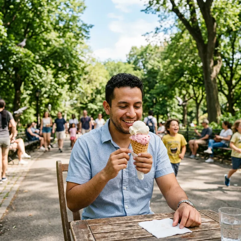 A person named Martin, of unspecified descent and gender, happily enjoying an ice cream cone on a sunny day. He's outside, seated at a small table in a vibrant park, with the pale . The ice cream is a double scoop, a layer of delicious strawberry and an enticing vanilla. A soft smile adorns his face as he savors every bite of his treat. In the background, there's a bustling scene, with birds chirping, kids playing, and a gentle breeze rustling through the trees.