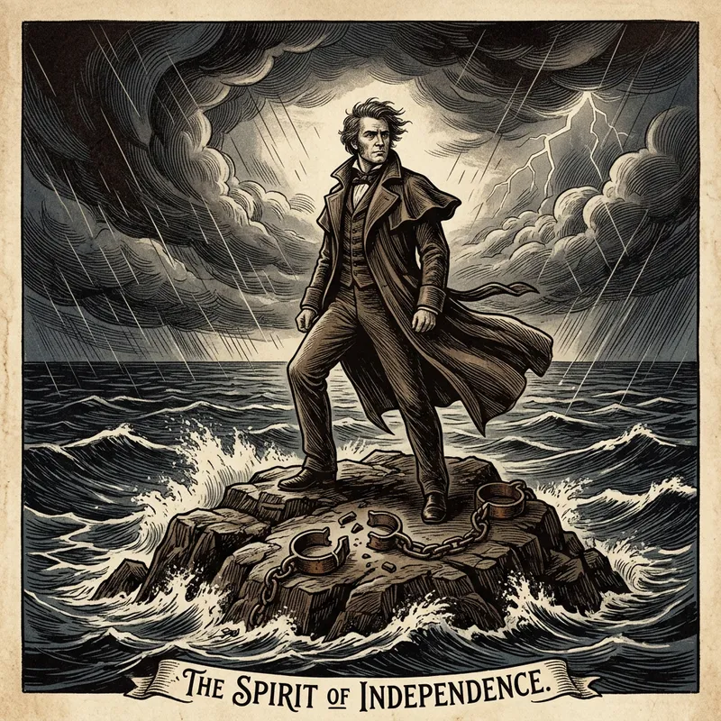 Abstract visual representation of freedom, independence, and self-reliance inspired by the 19th-century thoughts and ideologies. Use elements like broken shackles, a lone figure standing against a storm, and an island amidst vast waters to symbolize these thoughts.
