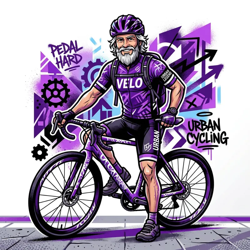 stylized mascot of a cyclist with a beard and medium-length white hair, one foot on the ground, looking towards me, in a modern street art style, with a dominant purple color and a white background. To be used for a logo.