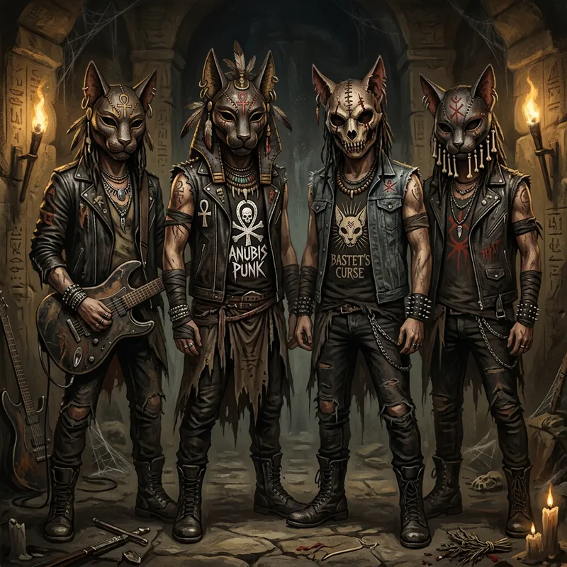 Mask with style Egito antigo members band differents logo macabre leather cat voodoo digital painting, horror art style.