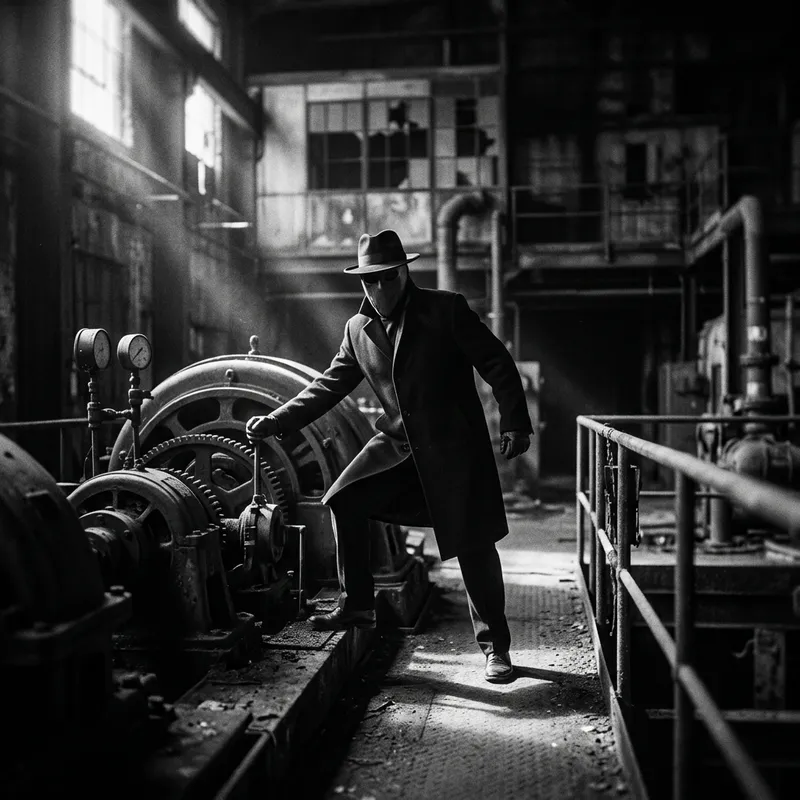 A suspenseful thriller scene featuring a mysterious, masked figure in an abandoned industrial setting. The scene is styled akin to early 20th-century film noir aesthetics characterised by high contrast shadows and highlights, striking poses, and obsolete equipment. The figure is captured using a vintage film camera representation, rendering all elements in grayscale, capturing a profound depth of black and white tones, adding to the drama and mystery.