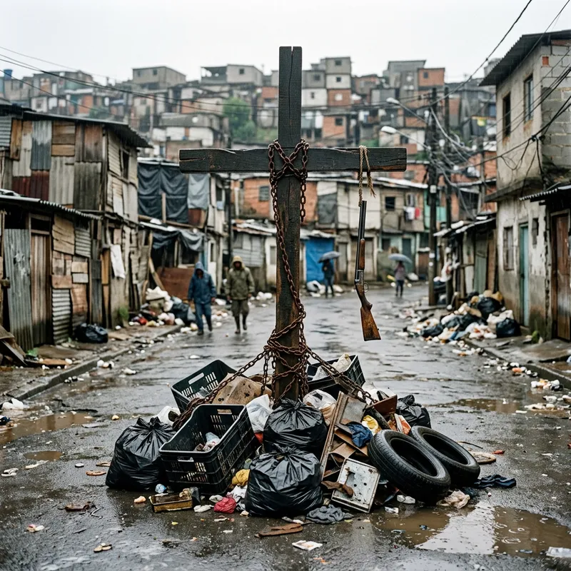 A massive wooden cross sits atop a heap of discarded items on a wet street bespeckled with puddles. The cross is ensnared by chains and from it dangles a shotgun. Behind this intriguing foreground, a slum extends its reach, teeming with deteriorating shanties and waste accumulating along the street sides.