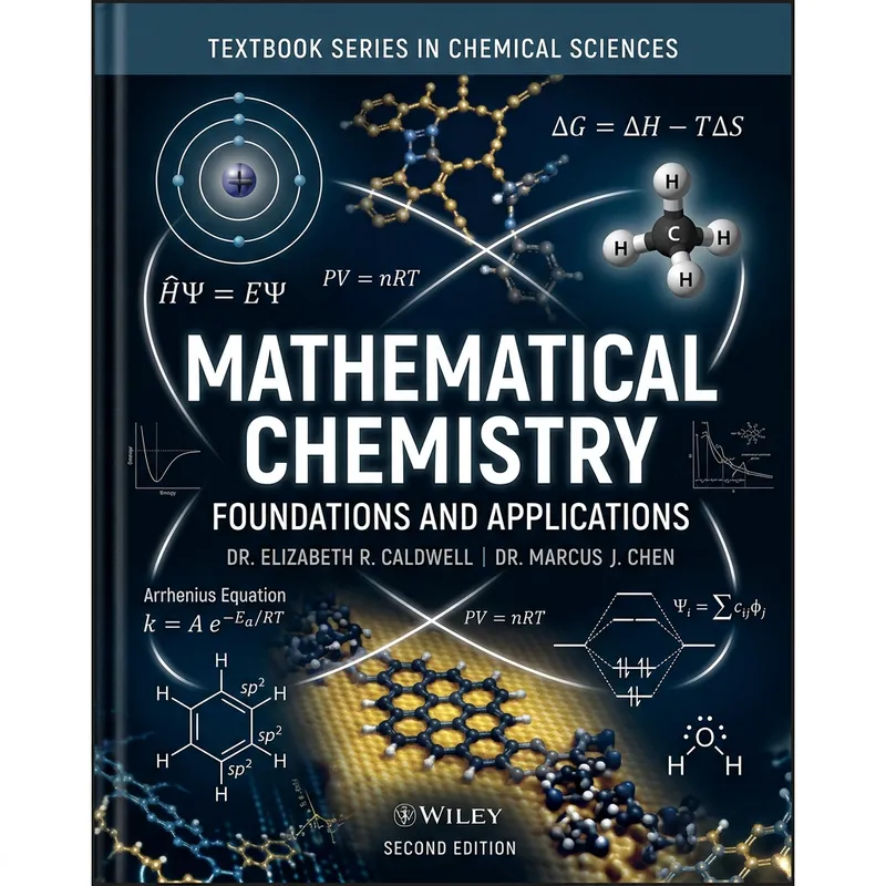 Generate a textbook cover featuring symbols related to Mathematical Chemistry. It should include atomic structures, analytical formulas, and mathematical equations. The background should feature a microscopy image of a molecule. Please make sure all elements are arranged harmoniously, and the title 'Mathematical Chemistry' stands out prominently in the center.