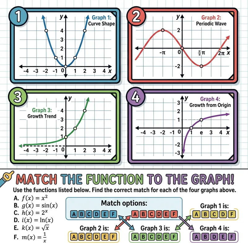 A image displaying four different graphs, each graph representing a unique mathematical function. There are multiple choice options indicating various functional expressions. The challenge is to match the correct functional expression to its corresponding graph.