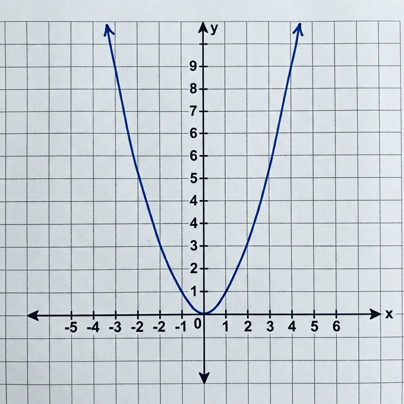 Create an image depicting a clear, well-defined mathematical parabola. It should be drawn on a white background with a grid-like structure similar to that of a graph paper. The parabola should be in a contrasting color like blue or black for the visibility. Also, there should be numbered axes to give the graph a precise look, and an arrow at each end of the axes indicating their infinite nature.