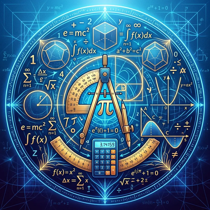 An image representing the concept of mathematics. It could contain symbols, like geometrical shapes, equations, numbers, and function graphs. It could also include classic tools used in mathematics like a calculator, compass, protractor, and ruler. All of these elements should be arranged in a creative way to form an attractive profile picture. The background should be a gradient of light to dark blue to depict the depth and complexity of this field.