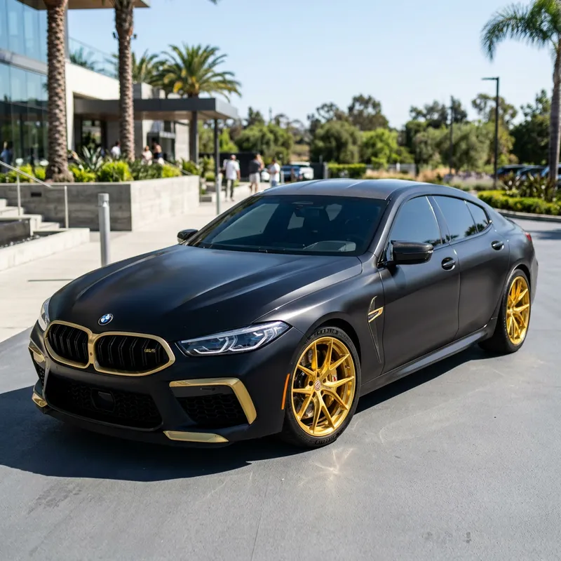 A matte black BMW M8 Competition model, equipped with golden wheels and golden details. The car is parked in a smooth surface under a bright, sunny day, reflecting off its glossy finish. Shadows softly underline the curves and edges of the car, emphasizing the sleek, aerodynamic design. The golden details shimmer in the sunlight, adding an luxurious touch to the high-performance vehicle.