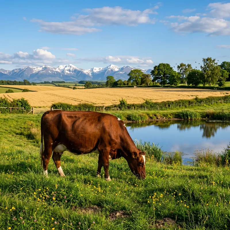 Visualize a mature, healthy cow in a peaceful countryside setting. The cow is a rich, deep brown color and stands lazily in a lush pasture, abundant with green grass. A serene pond mirrors the clear, cobalt-blue sky nearby. In the background, golden wheat fields ripple in the light breeze. Tall, majestic mountains painted with white snowcaps provide a dramatic backdrop. Birds flit between trees that dot the horizon, their songs mingling with the gentle mooing of the cow. The light of the late afternoon sun bathes the scene in a warm, welcoming glow, encapsulating a day in the life of a cow.
