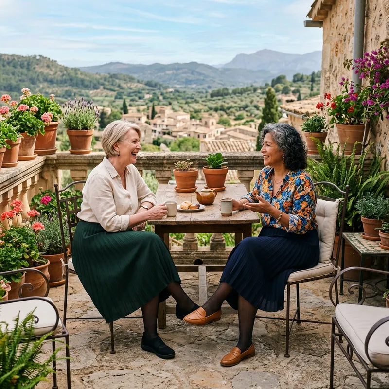 Mature Women in Blouses and Skirts on Terrace