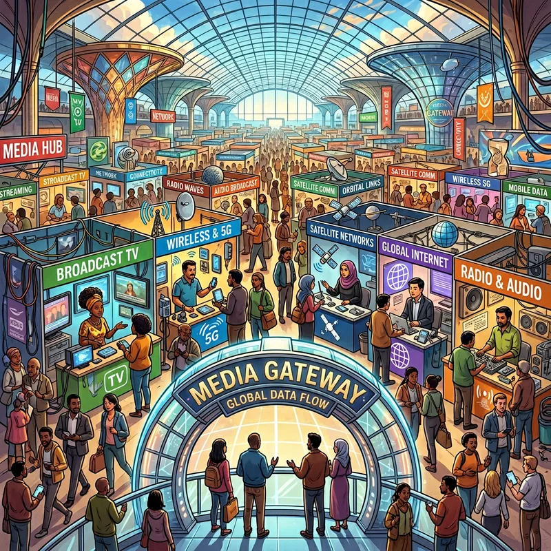Illustrate an abstract concept of the Media Gateway Market. Show a grand marketplace filled with numerous stalls. Each stall is representing different media technologies like TV, radio, internet, satellite, and wireless communications. Seen running the stalls are a variety of people of different descents and genders such as a Black woman, a Hispanic man, a Middle Eastern woman, etc. In the foreground, place a digital gateway overlooking the market. The scene should have a bustling atmosphere, with people interacting, discussing and trading.