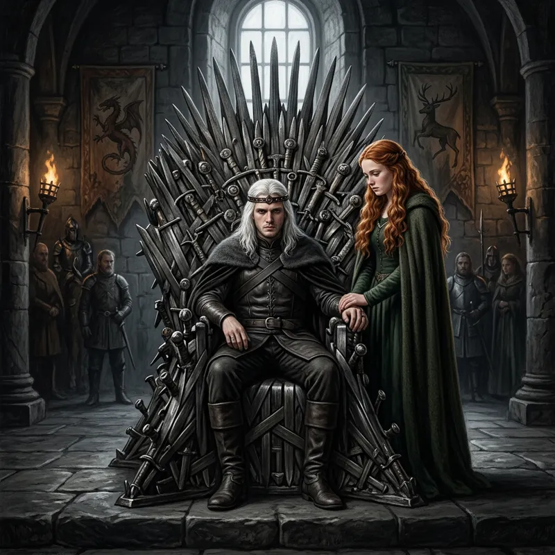 A young Caucasian man with long white hair, devoid of beard, seated on an intricate throne made entirely of swords. Beside him, a young redhead Caucasian girl stands, her hand gently holding his. The atmosphere permeates gloom, as though a heavy weight of uncertainty looms over the regal duo. The art style echoes the tradition of realistic drawing, capturing lifelike expressions and minute detail in every aspect. The setting communes the atmospheric tension and political struggle commonly associated with medieval fantasy narratives.