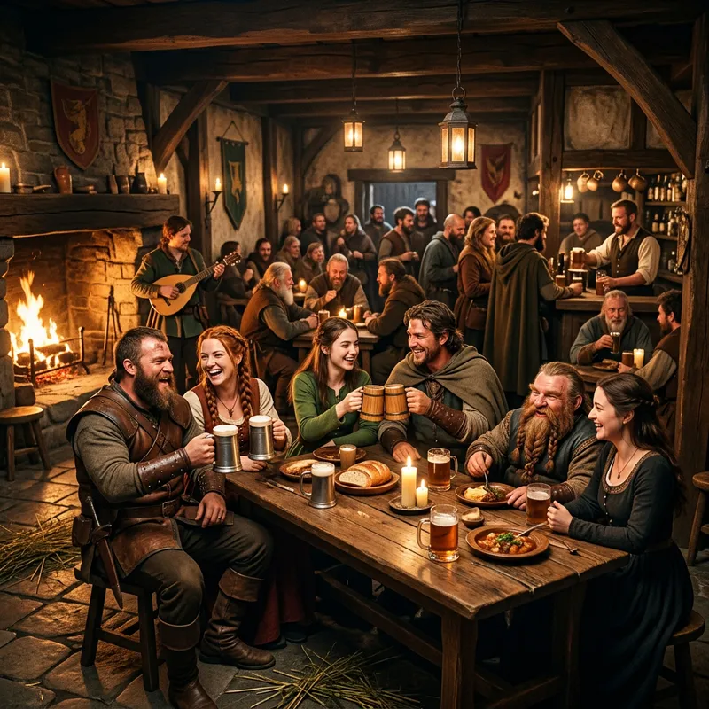 Medieval fantasy tavern setting where men and woman come together to have a good time.