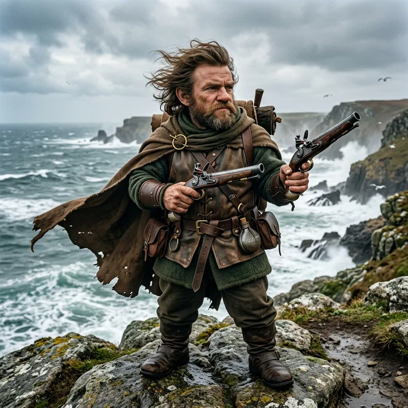 An image of a gnome with wind-swept brown hair, wearing medieval-style clothing, with two flintlock pistols in his hands.
