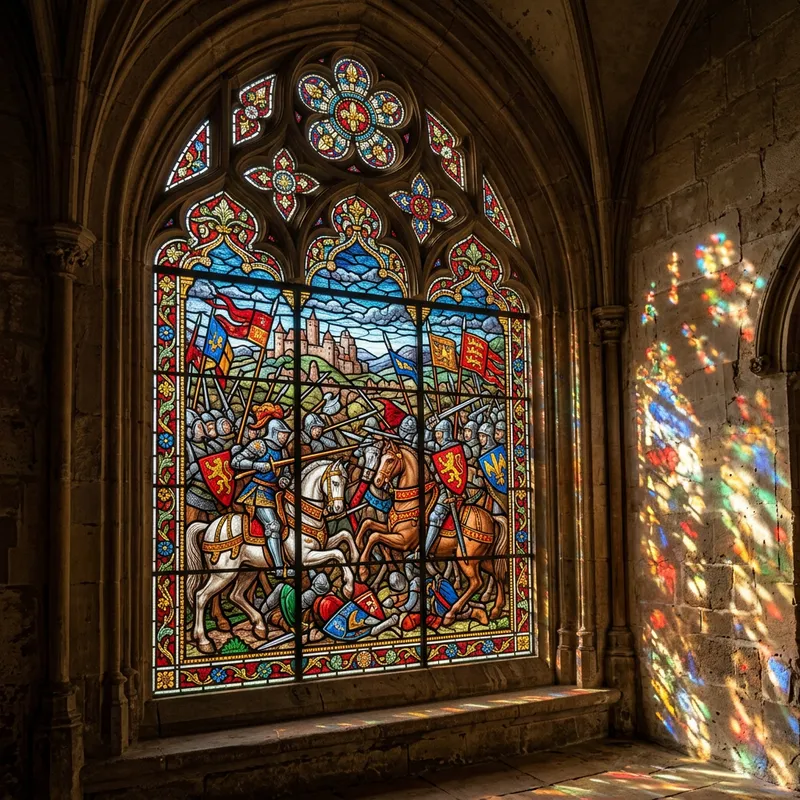 An image of a medieval stained glass window, vividly depicting a battle scene from a bygone era. The scene should showcase an array of armored knights clashing in combat adorned with banners in a pastiche of intricate colors, capturing the relative tranquillity or turmoil of the medieval warfare. Surrounding it all, the intricate designs and patterns of the stained glass frame the scene, casting vibrant shadows that playfully dance upon the stone walls.
