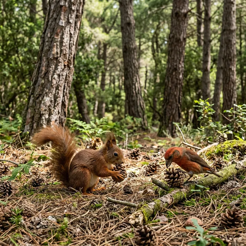 Mediterranean Forest: Squirrel and Crossbill Feeding
