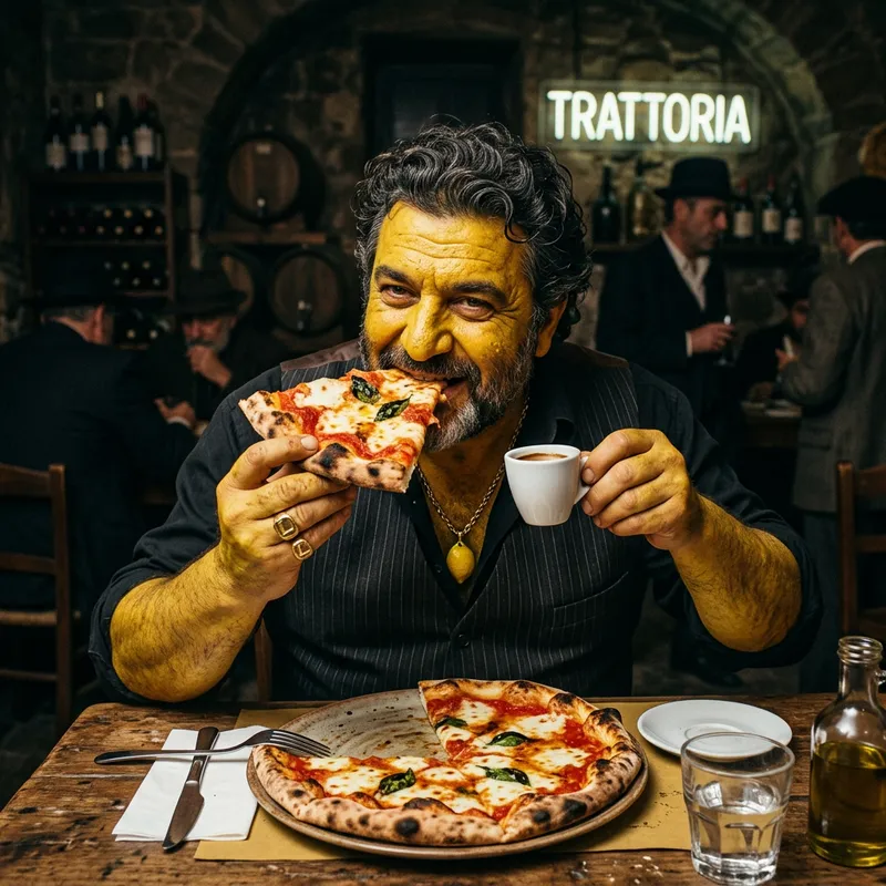 A representation of a lemon as a human figure. This character is part of an underground syndicate subtly hinting at its mafia ties. He is depicted as a Mediterranean man passionately enjoying a cup of coffee and a slice of delicious Italian pizza.