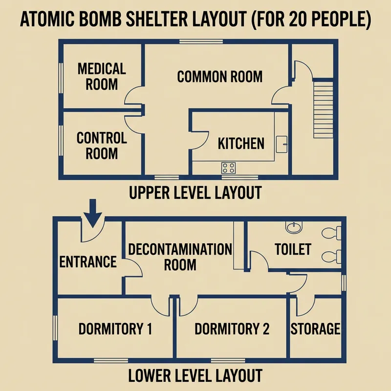 This is an image representing the layout of a medium-sized atomic bomb shelter built for 20 people. The lower level consists of an entrance towards the top left, a decontamination room towards the left center, dormitories at the bottom left and right, toilet facilities at the top right, and a storage room at the bottom right. The upper level consists of a common room at the top center, a kitchen to the right of the center, a medical room at the top left, and a control room at the left center. The vent system, medical equipment, supplies, energy sources, communications, air filtration system, and water recycling system are not represented in the layout. This image provides a visualization of the design of the atomic bomb shelter. Specific details might vary based on design and available resources.
