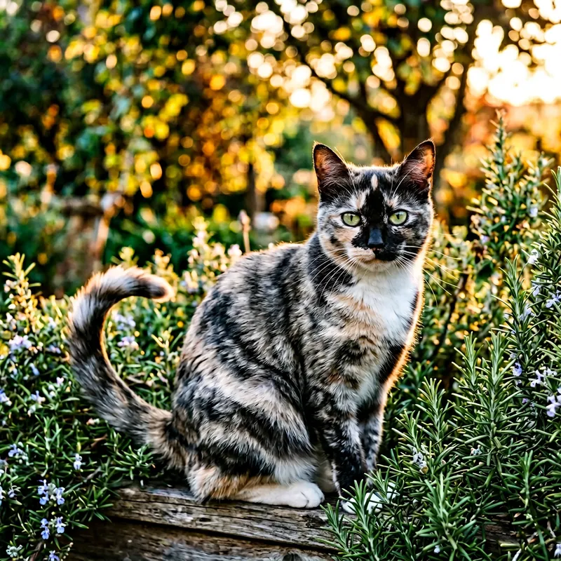 A close-up image of a beautiful domesticated cat of a medium-sized breed. It has sleek, short, and well-groomed coat in a mix of black, white, and grey colors. Fierce green eyes stare attentively into the camera, and an arc formed by its perfectly curved tail conveys a sense of tranquility. A serene evening glow from a setting sun, casting gentle, warm light onto the feline, creating a captivating scenery in the background. Lush, vibrant green rosemary bushes add an elegant touch, accentuating the features and beauty of the enigmatic creature.