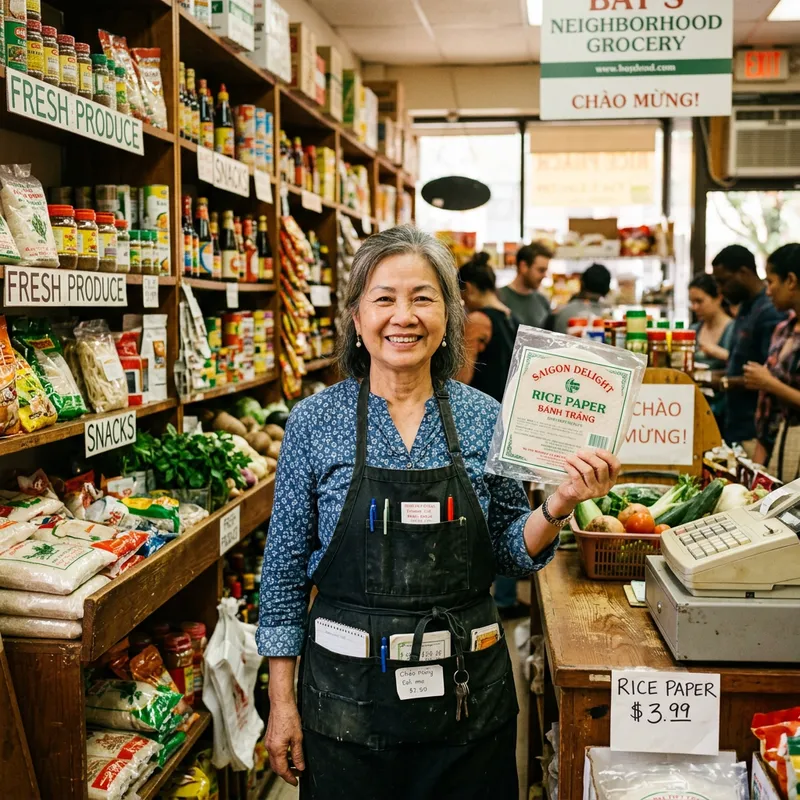 An older Asian woman, Mrs. Bay, who stands proudly in her small, yet abundant grocery store, surrounded by shelves filled with various food items. She is holding a pack of rice paper up for display, showcasing it to potential customers. The atmosphere is inviting and cozy, reflecting the store's reputation as a hub in the local neighborhood. Mrs. Bay wears a light, long-sleeved blouse, complemented by an apron with various pockets holding different convenience store accessories. Her warm, welcoming smile communicates years of dedication to serving the community.
