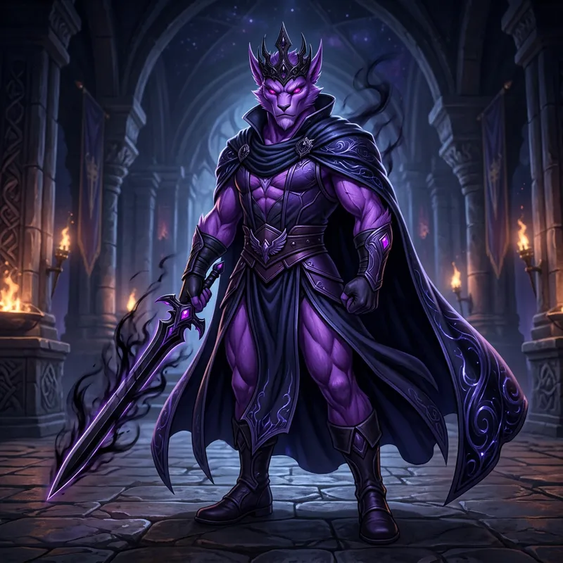 A tall anthropomorphic character with a sleek, muscular body in a vibrant shade of purple. Its piercing magenta eyes contrasted beautifully against its cobalt-black cloak, swirling with elements of mystery and elegance. The character's head is adorned with a dark, shadowy crown, adding an aristocratic touch. In one hand, it holds a shadow sword, a dark blade that seems to absorb all surrounding light. The impactful combination of matt black and gleaming purple paints a consequence of authority and rebellion, juxtaposing a majestic charm and elusive allure.