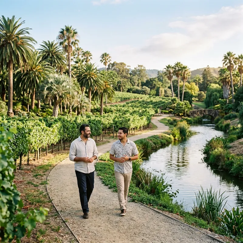 An image depicting two men, one of Middle Eastern descent and the other of Hispanic descent, walking side by side in a vast expansive garden. The garden is rich with palm trees and grapevines, providing a lush, green backdrop. Alongside the men flow serene rivers, which meander through the landscape, enhancing the picture of tranquility and peace.