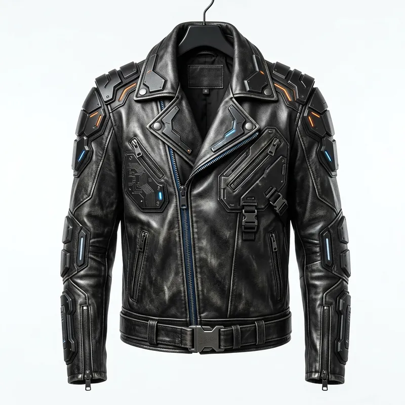 Visualize a men's leather jacket in a cyberpunk style, inspired by Marlon Brando's iconic biker aesthetic. The jacket is displayed on a plain white background, as typically observed in product photographs on e-commerce platforms like Amazon. The jacket may feature a notable metallic sheen, sharp angles, and high-tech elements found in cyberpunk fashion.