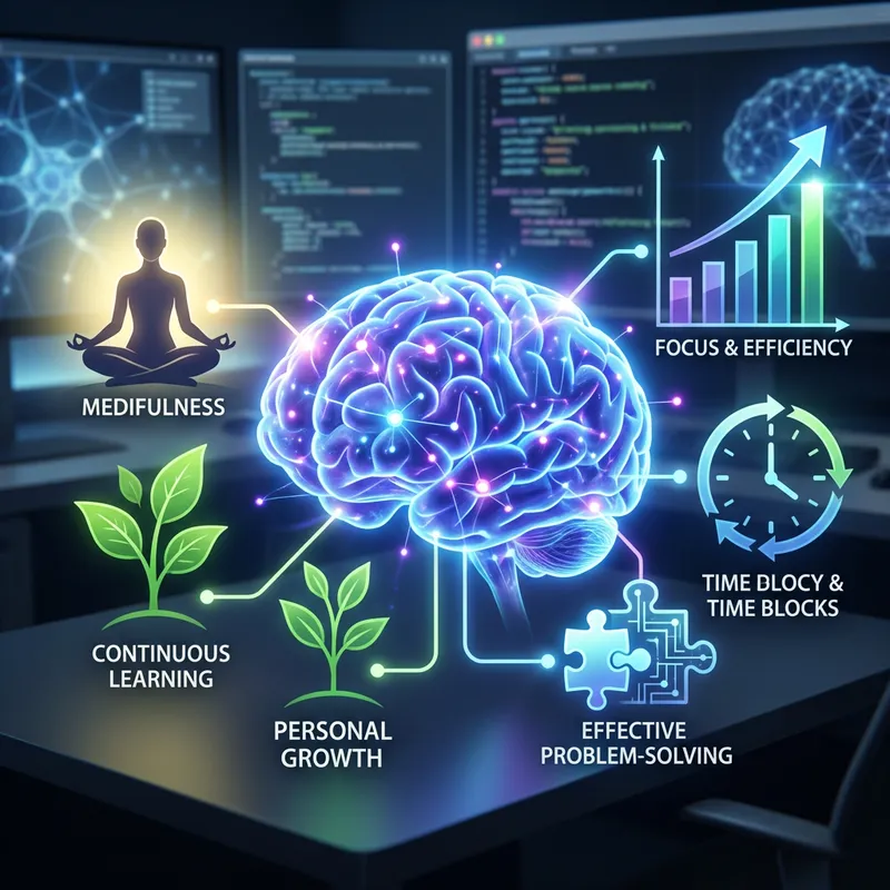 Visualize mental techniques optimizing performance. Picture a brain aglow with activity, symbols of introspection such as a meditative figure and personal growth like a growing plant. Also depict related graphics like bar chart progressing upwards, a clock showcasing time management, and a puzzle piece symbolizing problem-solving.