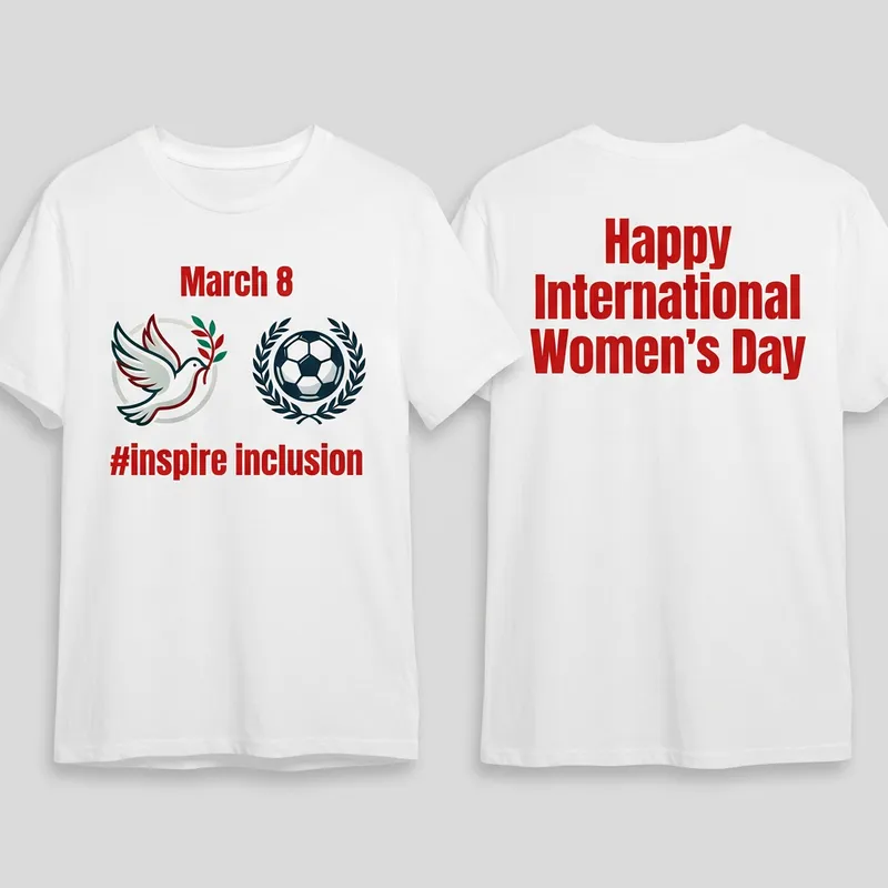Design a white T-shirt. The front of the T-shirt must feature two emblems–one for a proposed mercy organization, represented by a dove holding an olive branch, and another for a fictional sports federation, symbolized by a ball within a laurel wreath. The text 'March 8' and '#inspire inclusion' should also be present in red color on the front. On the back of the T-shirt, add the phrase 'Happy International Women's Day' in bold, red letters.