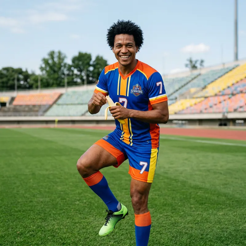 A professional football player with short, curly dark hair joyfully holding a ripe banana, wearing a brightly colored sports uniform. The player is in a dynamic pose, showcasing his athleticism and endurance. He is outdoors, on a well-groomed grassy football field.