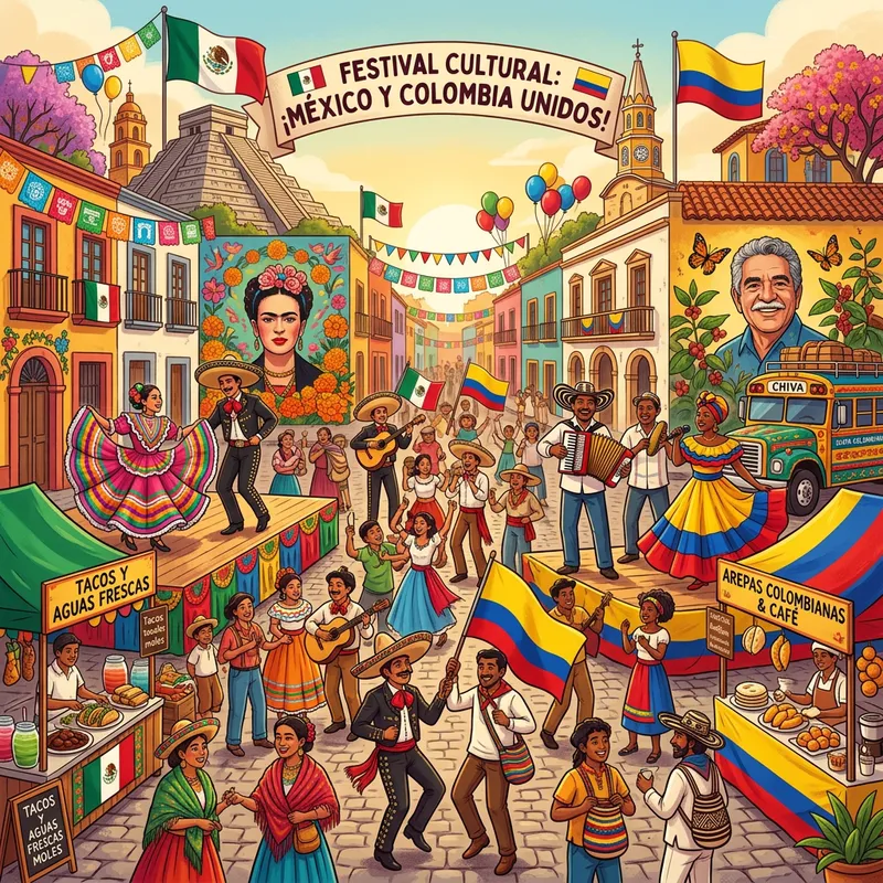 Create a vibrant and lively illustration showcasing the cultural elements of Mexico, with a twist that incorporates aspects of Colombian culture. This fusion should highlight notable landmarks, traditional outfits, food, music, and art from both countries. This colorful display of integrated cultures should reflect a harmonious blend of Mexican and Colombian heritage.