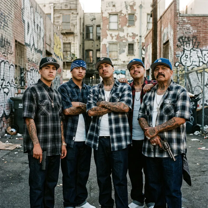 A scene portraying Hispanic gangsters, armed and posing in an urban environment. Their gang affiliations are hinted by unique tattoos, colorful bandannas, and custom jewelry. The cityscape in the background is marked by graffiti-covered walls, dimly lit alleyways, and looming, rundown buildings. The gang members have varied expressions, some appear stern and unforgiving, while others smirk with a dangerous underpinning. The weaponry they hold is diverse, including both sleek, modern firearms and old-school revolvers.
