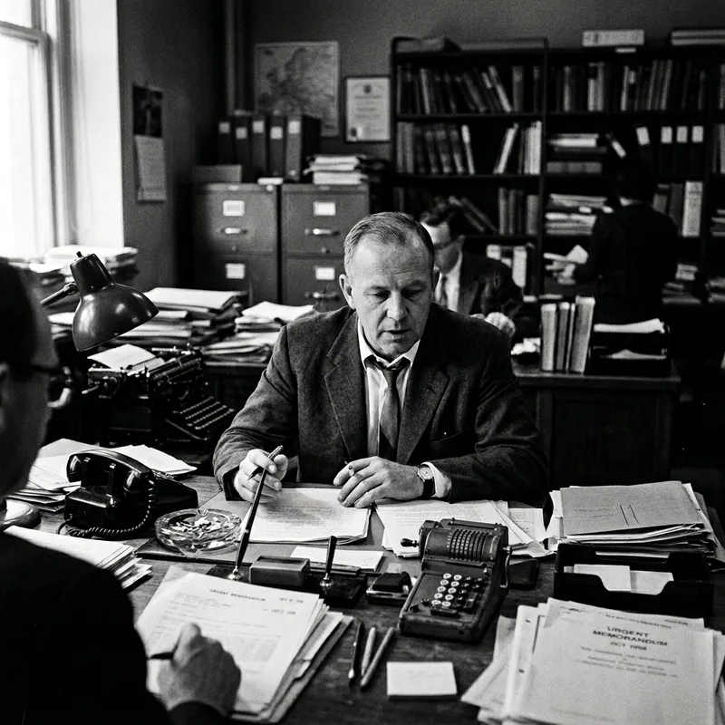 A black and white photo of an unidentified mid-20th century politician at work, capturing the essence of documentary photography. The image should have a strong contrast between light and shadow, emphasizing the intricate details of his surroundings. The image should evoke the photographic attributes of a Leica M10 camera using a 50mm lens, upholding the compositional standards of traditional photojournalism.