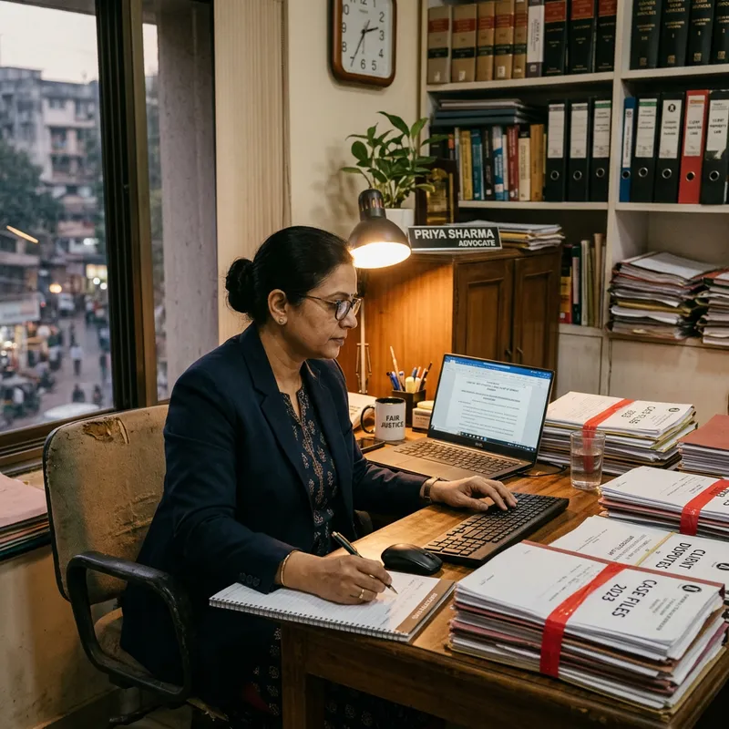 A mid-age South Asian female advocate working diligently at her office desk. She has a laptop open in front of her, displaying a legal document. She's wearing a formal suit and glasses, her hair tied up neatly. Stacks of legal papers are piled to her side, and she seems to be deeply engaged in her work. The indoor scene is lit with warm, soft light, casting long shadows on the papers, creating an atmosphere of quiet focus and dedication.
