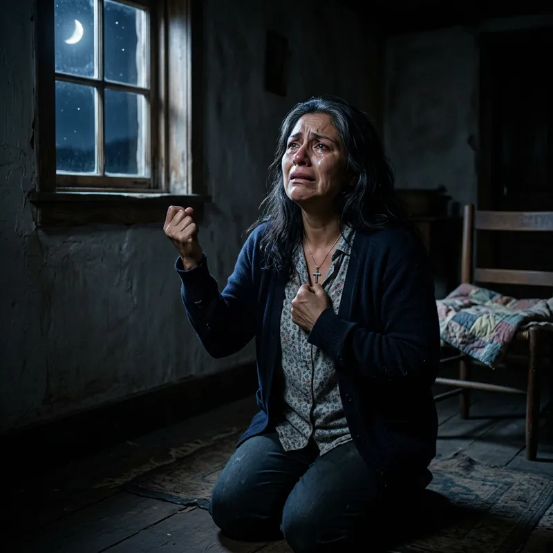 A highly emotional scene depicting a mid-aged Hispanic woman expressing great despair. Her face reflects deep sorrow as she clenches her fist and looks towards the sky. The setting is a dimly lit room with minimal furnishing and a single window pouring in a stream of moonlight.