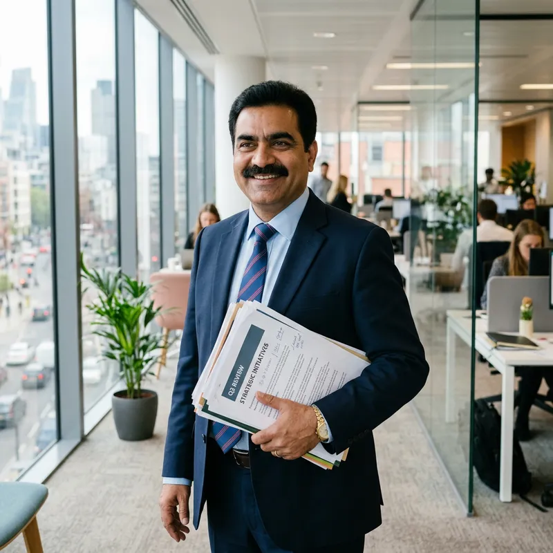 A middle-aged Indian man with thick black hair, eyebrows and moustache. He wears a simple suit and tie, has a kind smile on his face, and is holding a bunch of papers. His eyes are focused and he radiates a thoughtful and determined aura. He is standing in a modern office environment with large windows, and the room is filled with natural light.