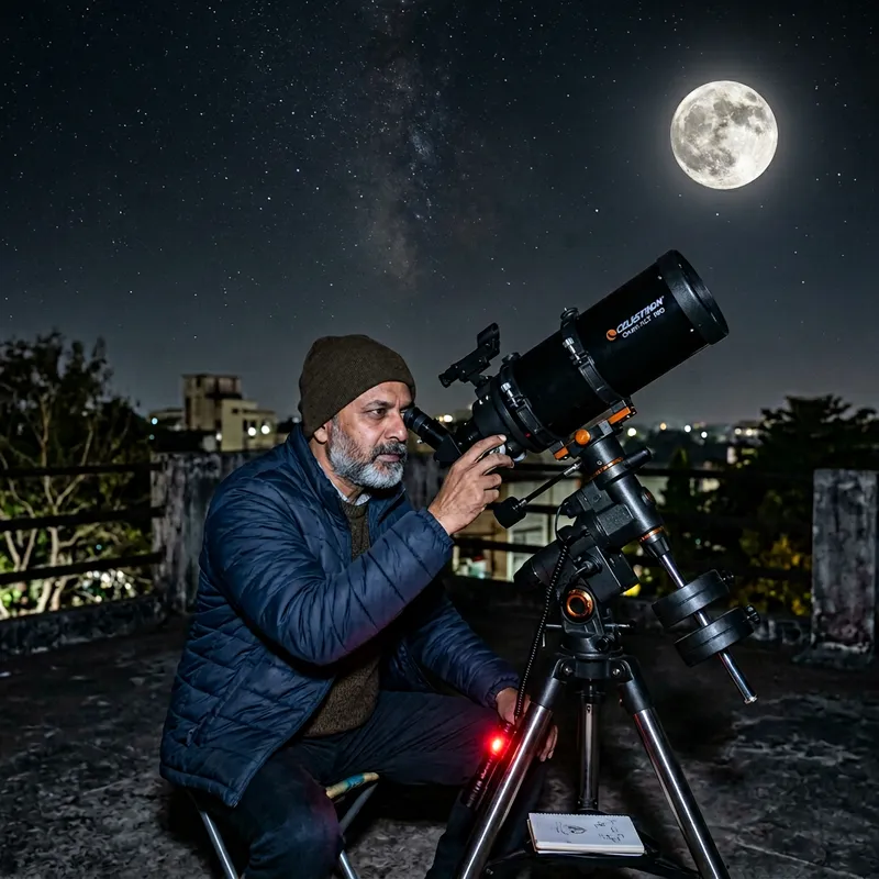 A middle-aged South Asian man is using an astronomical telescope, designed for stargazing, to observe the moon. He meticulously aligns the device to get the best view. The moon, full and bright, stands prominent against the dark night sky, sprinkled with glimmers from distant stars. A sense of awe and wonder envelops him as he tries to comprehend the celestial beauty above. His face is lit by the feeble yet soothing moonlight filtering in through the eyepiece of the telescope. The silence of the night coupled with his intense concentration accentuates the calmness of the scene.