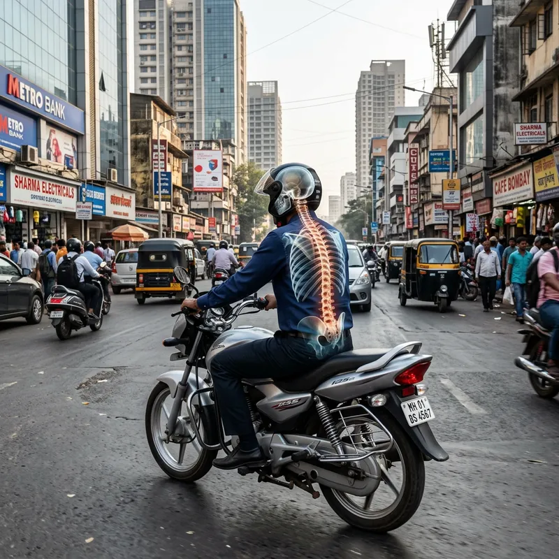 Create an image of a middle-aged South Asian man wearing blue formal attire, riding a silver 125cc motorbike with streamlined design elements through the city streets of a bustling Indian city. The cityscape is adorned with skyscrapers along the gray pavement. The back of the man is showcased in an X-ray view, displaying the spine, giving a unique perspective on the typical urban scene.