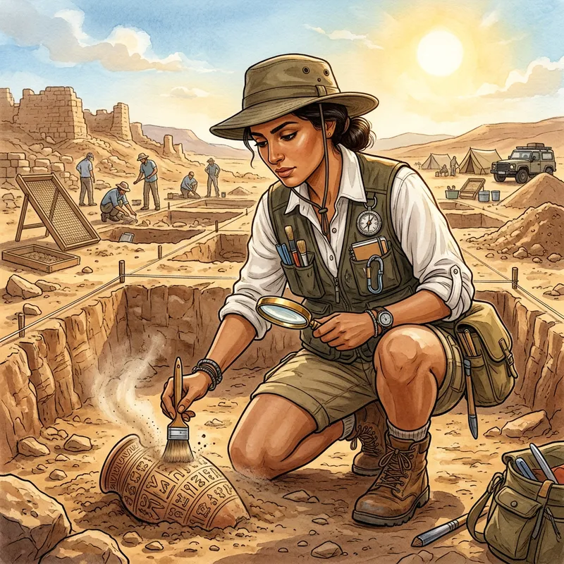 A full-length, detailed illustration of a woman archeologist of Middle Eastern descent. She's wearing khaki shorts, a white button-down shirt, a vest with plenty of pockets, a sun hat, and sturdy brown hiking boots. Her demeanor is one of determination. She gingerly brushes away at a partly exposed ancient artifact with a small tool in her hand. In her other hand, she's holding a magnifying glass. Dust is slightly stirring up from her work and the glow of the hot sun is visible in the background.
