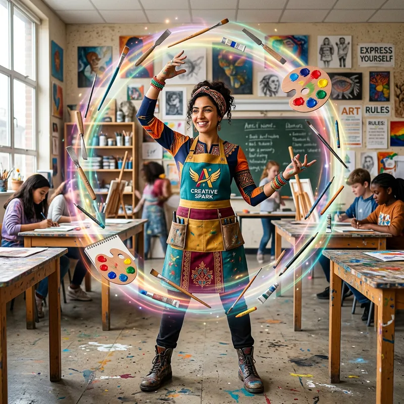 Create a detailed image of a Middle-Eastern female art teacher who resembles a superhero. She should appear vibrant and dynamic, with various artistic tools floating around her as if they are her superpowers. Paintbrushes, color palettes, chisels, and charcoal pencils all defy gravity, orbiting her in a stunning display of her artistic prowess. She's standing in an arts classroom, with student artworks hung on the walls. Her attire combines conventional teaching outfits with elements of traditional superhero costumes, expressing her dual identity.