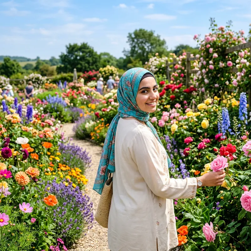 A picture of a Middle Eastern girl wearing a hijab, looking over her shoulder in a location filled with a variety of colorful flowers. The scenario unfolds under a clear, bright sky. Her eyes are filled with curiosity and appreciation as she admires the vibrant hues around her.