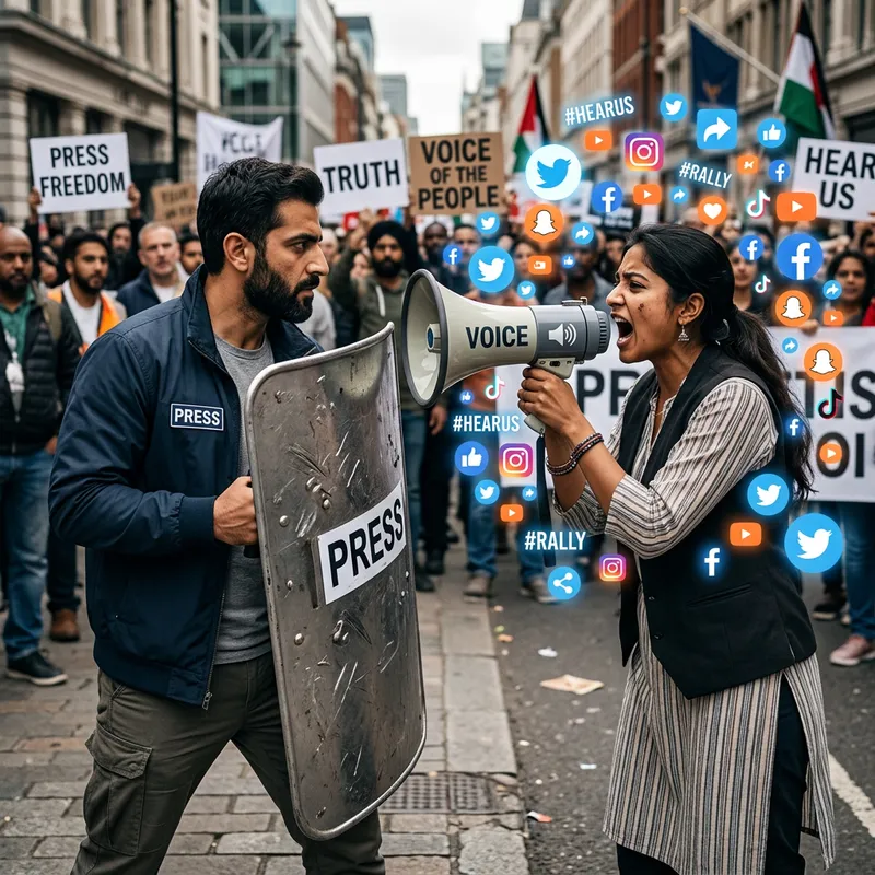 An intricate scene featuring two individuals in opposition. One person, a middle-Eastern male, wields a robust shield emblazoned with a small symbol 'press' on his shirt. Simultaneously, the other individual, a South Asian female, is holding onto a booming megaphone with fervor. Around her, a visual bustle of social media icons floats, demonstrating the integration of traditional and digital media.